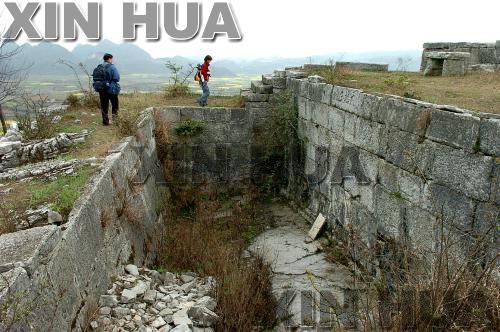 两位贵阳市游客从燕楼古营盘的一个巨大石坑旁走过