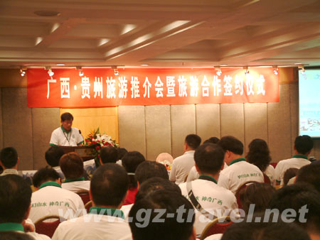 今日下午18时,广西·贵州旅游推介会暨旅游合作签约仪式在贵阳柏顿酒店隆重召开。广西旅游考察团由广西旅游局黄桂辛局长任团长、陈其娴副局长任副团长,成员包括广西14个城市旅游局局长、市场开发部门负责人和县(市)旅游局局长、旅行社、景区负责人及新闻媒体记者等。仪式上贵州省旅游局傅迎春副局长致开幕词,广西旅游局黄桂辛局长对广西旅游进行了总体介绍,之后双方相互宣传推介了旅游产品,加强了旅游宣传促销方面的合作。在推介会热烈洋溢的气氛中,广西的南宁、河池、柳州、桂林等城市旅游局与贵州的贵阳、黔南州、黔西南州、遵义、黔东南州旅游局签订旅游合作协议,进一步丰富和深化两省区旅游合作内容。双方的旅行社、景区等企业负责人也利用推介会这一平台深入交流,不断拓展空间。