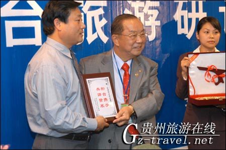贵州省旅游局副局长傅迎春向台湾观光学会会长唐学斌赠送纪念牌