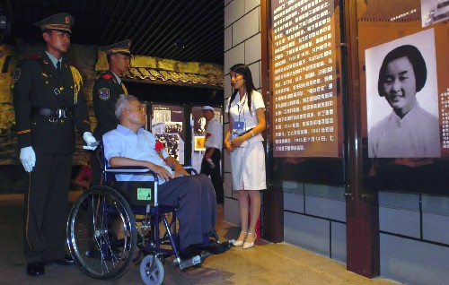 8月19日,张露萍烈士生前的革命伴侣李青(左三)正在听解说员讲解张露萍烈士的革命事迹。