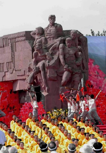 8月19日,舞蹈演员正在表演歌舞《绣红旗》。