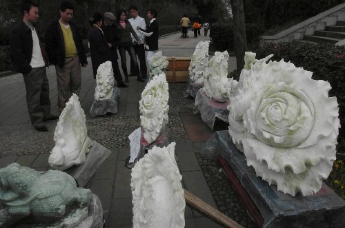 2月20日,参观者在贵阳河滨公园观看一位辽宁奇石收藏爱好者展出的“辽宁岫石”。