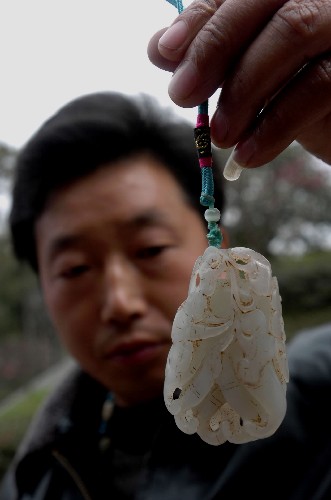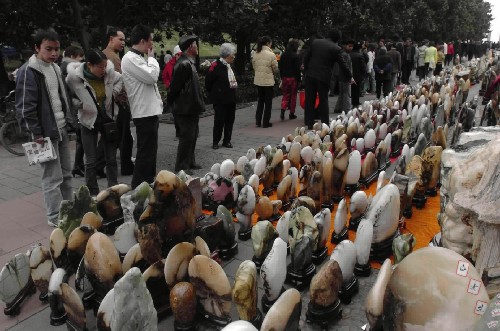 一位来自四川的奇石收藏爱好者在贵阳河滨公园展示新疆和田玉。