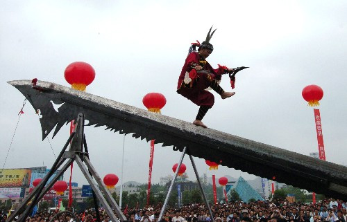 在各种表演活动中,苗族大刀王吉靖羽表演的《赤脚斜走大刀》节目格外引人注目。这把长12米、重达3吨的大刀距地面10多米高,呈斜坡状,其刀刃锋利,吹可断发。吉靖羽赤脚在刀锋上行走,每迈一步,观众都会发出阵阵惊叹。这一融合了苗族轻功、气功等绝技的节目,源于吉靖羽的苦心钻研和创造,曾在第六届中国民间艺术节全国民间艺术表演赛中荣获“民间绝技金奖”。