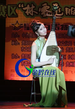 代表云岩区参赛的徐小雯身着漂亮的绿色晚礼服抱着琵琶,深情款款的站上了舞台。她为大家带来的是一节由两个段子合成的曲调,节奏性较强。动人的旋律从小雯的指间缓缓流出,婉转悠扬的乐曲立刻回荡在剧场内,情到深处她便嘎然而止,给观众留下了无尽的回味。这次决赛,徐小雯本来准备的是京剧表演,可是在总决赛的前几天,导演组告诉她,如果能换成琵琶表演的话,舞台效果会更好,晚会也更具可看性。听了导演的建议后,徐小雯立刻决定,为了照顾大局,她重拾已“丢”了好几年的琵琶。从古筝演奏到京剧舞蹈表演再到琵琶演奏,这无疑体现了徐小雯的多才多艺。徐小雯离家6年一直在北京打拼,总共在家的日子还不到17天。这次她放下了手头所有的事情来参加“多彩贵州形象大使选拔赛”,在家呆了一个多月,非常地高兴。她说:“能在这个舞台上走到现在,我很满足。这次参赛我很看重,因为钱可以再赚,可是这样的机会过了就不会再来了。所以我毫不犹豫的抛开一切,把这次比赛准备好,希望能笑到最后。”