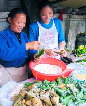 我国的传统节日端午节日益临近,贵阳市个体商家抓住商机,推出了各种具有民间特色的火腿、大枣、香肠粽子上市,散发着浓浓箬竹叶香的粽子吸引了不少顾客购买品尝。