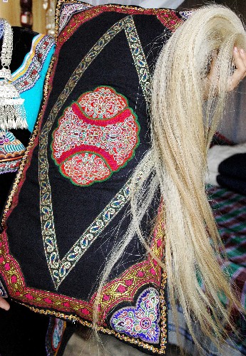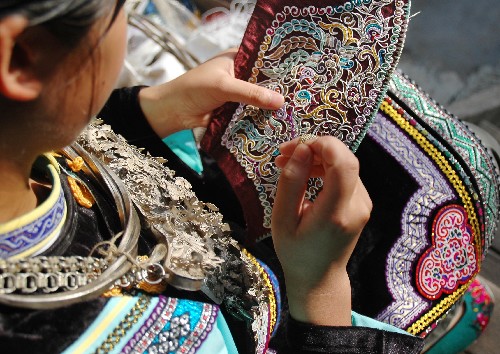 今年6月初入选首批国家级非物质文化遗产名录的马尾绣,是水族地区现存的一种原始艺术,被称为刺绣的“活化石”,是研究水族民俗、民风、图腾崇拜及民族文化的珍贵艺术资料。马尾绣的制作方法是,将两三根白线缠绕在几根马尾毛上,然后把缠好的马尾毛盘在已描绘好的花纹轮廓上,再根据轮廓线绣出各种图案,共需要52道工序才能完成。
