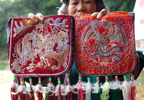 贵州三都水族自治县中和镇姑引村的一位村民在展示马尾绣包。