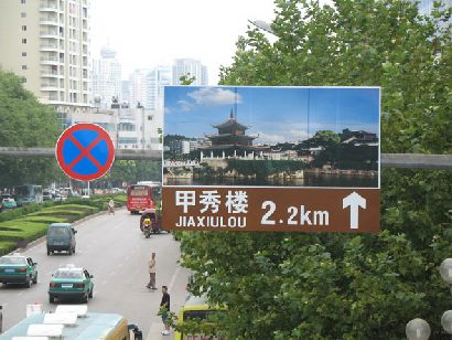 昨日,贵阳市遵义路241路公交车起点站路边的铁杆上,安装了一块写有“甲秀楼 2.2公里”的旅游标牌。
