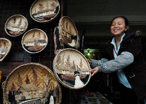 一位店主在青岩古镇向游客介绍富有地域特色的工艺品