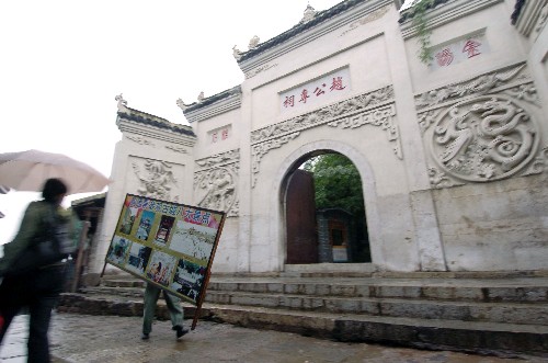 青岩古镇的工作人员搬着景点展板从赵公专祠门前经过