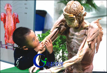 据介绍,由于标本经过了“无毒无味”的塑化处理,参观者不仅可以从皮肉到内脏把真人标本看个清楚,甚至还可以直接触摸。而制作这样的人体标本,花费昂贵,其中一件“人体断层标本”,价值在200万元人民币以上。