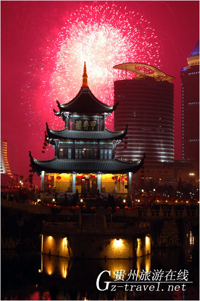 本站讯 “劈里啪啦……”随着2007年2月18日零时农历正月初一新年钟声的敲响,在甲秀楼附近等待观看焰火的市民顿时炸开了花,整个现场像拉开了欢乐的闸。色彩各异、造型优美的烟花在贵阳市人民广场的上空130米至240米之间绽放,筑城的夜空变得炫目璀璨。