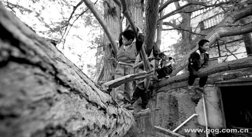 乌当区近日在新堡乡陇脚村发现一棵树龄大约近千年的银杏树。据当地林业站站长万亮说,这棵银杏树胸围4.8米,冠幅约20多米,高度约30多米,是在古树调查中新发现的。由于银杏树生长较慢,估计该银杏树树龄在800年左右。图为几位小朋友在近千年的银杏树上玩耍,他们将这棵“村树”作为玩耍之处,每天都要爬上爬下。