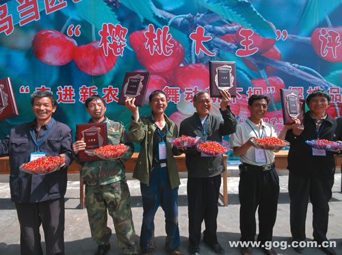 昨日,乌当区“樱桃大王”评选在该区岩山村举行。下坝乡翁簸村村民吴行刚凭借色泽鲜艳、颗粒均匀、甜度较高等指标获得了“樱桃大王”的称号。据悉,今年该区大约可产樱桃18万斤。图为获奖者领取证书。