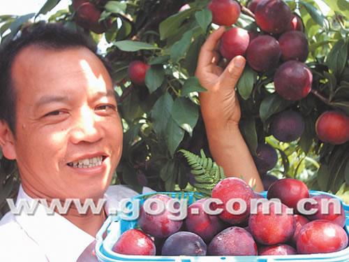 日前,记者在乌当区渔洞峡景区的花果山看到,一种原产自美国的新型水果布郎李在这里引种成功。8年前,东风镇村民廖正明从外地引进布郎李种苗进行栽培,经过8年的精心培育,现在已发展到300多株,大部分开始结果,树上挂满了紫色的布郎李。图为廖正明正在采摘成熟的布郎李。