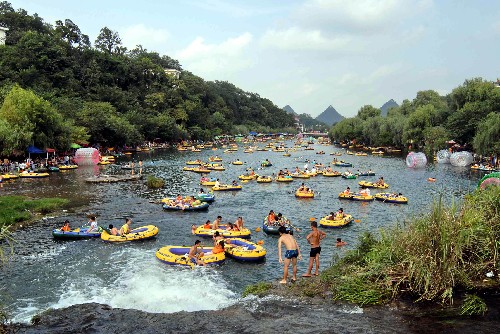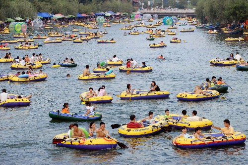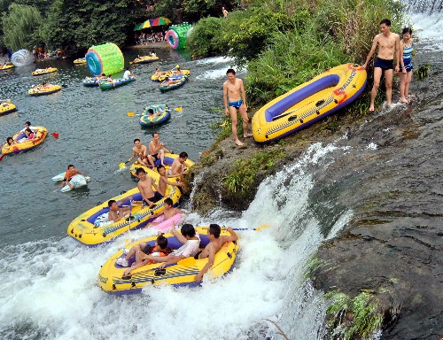 8月12日,许多游客来到贵阳市郊花溪区,乘坐五颜六色的橡皮船在花溪河上游弋,游泳嬉戏,享受清凉和惬意。