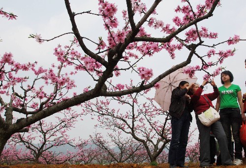3月29日,游客在桃花园里拍摄录像。
