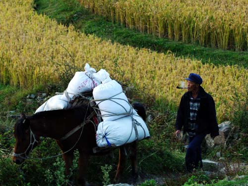 10月7日,贵阳市花溪区高坡乡大洪村农民运送刚收割的稻谷回家。