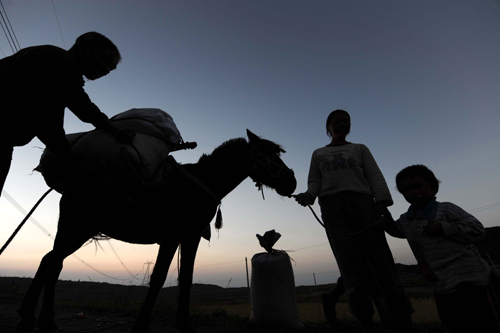 10月7日傍晚,贵阳市花溪区高坡乡大洪村农民运送刚收割的稻谷回家。