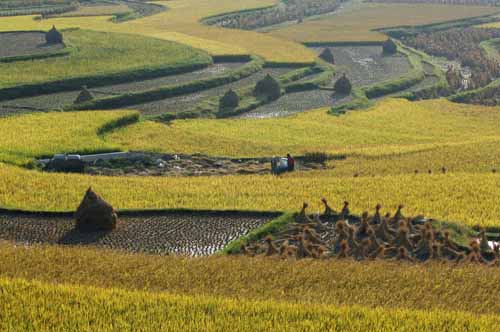 10月7日在贵阳市花溪区高坡乡拍摄的稻田。眼下贵阳已进入秋粮收割高峰期,农民们正利用好天气加紧抢收稻谷,颗粒归仓。