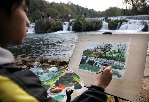 11月16日,一名中学生在坝上桥瀑布旁作画。