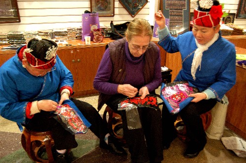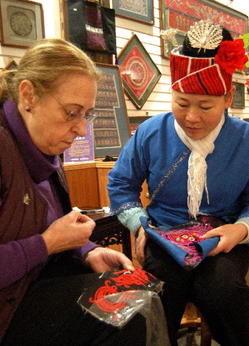 12月16日,贵州博物馆里的苗族绣女指导法国女学者弗洛朗斯·托斯卡练习刺绣针法。