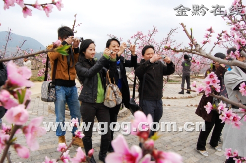 游客们被粉嫩的桃花吸引
