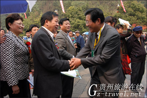 省委常委、副省长黄康生(左二)贵州省旅游局局长傅迎春(左三)副局长李秀珍(左一)向南江峡谷景区总经理江冬才询问景区情况