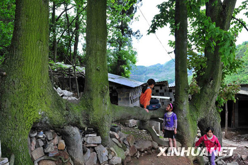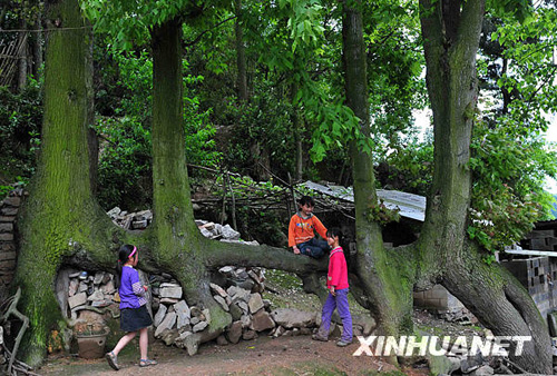 4月19日,村童们在“四树连根”怪树下玩耍。