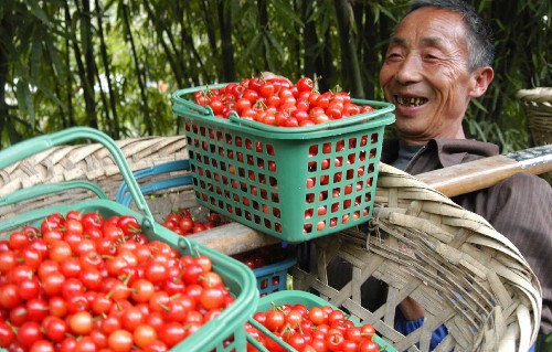 一位果农挑着刚采摘的“黑珍珠樱桃”出园