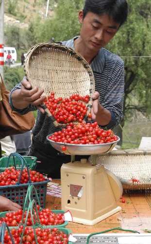一位顾客在贵阳市乌当区下坝乡岩山村科技樱桃园称量选购的樱桃