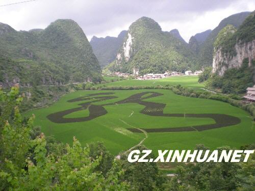 贵州安顺龙宫景区是一个国家5a级风景区,景区内用普通水稻和黑糯米水稻套种了一个植物汉字“龙”,其造型拓自唐代著名书法家怀素的草书。现字体为紫红色,背景为绿色。到成熟时节,其背景将变为金黄色。该字总占地面积120亩(约8万余平方米)。