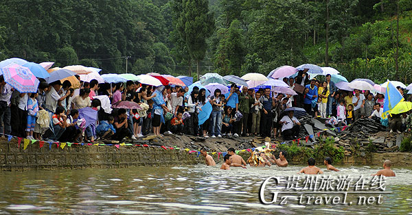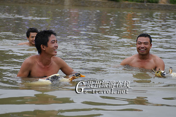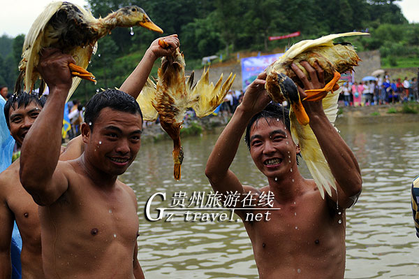 7月27日,在贵阳市乌当区偏坡乡举办了布依族传统节日六月六。开幕当天举行了布依祭盘古仪式、布依对歌赛,开展抢鸭子、抢花炮等民间体育活动,斗鸡、斗画眉等丰富多彩的娱乐节目,游客体验推豆腐等农家生活、布依婚俗、吃长桌婚宴,游客与当地布依族群众同游同欢。其中“抢鸭子”活动最为抢眼,吸引了不少游客纷纷加入、观看。按照规则,谁抢到鸭子就归谁所有,不论数量。