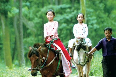 游客在长坡岭森林公园里骑马游玩