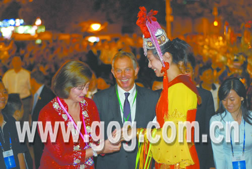 8月21日晚,英国前首相布莱尔偕夫人切丽在贵阳大剧院观看大型民族歌舞诗《多彩贵州风》,古朴、原生态的民族歌舞表演,醉倒了前来出席生态文明贵阳论坛的布莱尔夫妇等海内外嘉宾。这是在贵阳大剧院门口,切丽在欣赏一名贵州姑娘手上的银饰。