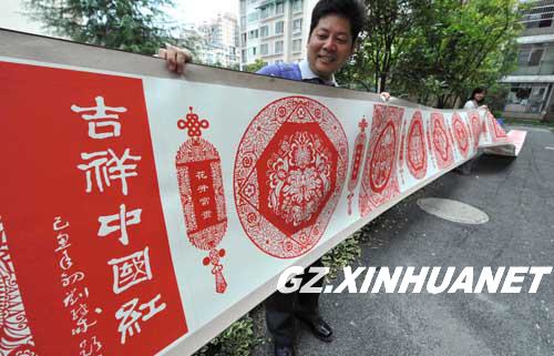 2009Äê9ÔÂ4ÈÕ£¬ÔÚ¹óÑôÊнðÑôÐÂÇø£¬Öлª¼ôÖ½ÒÕÊõίԱ»á¸±ÃØÊ鳤ÍõÉÙ·áÕýÔÚչʾËûµÄ¼ôÖ½×÷Æ·¡¶¼ªÏéÖйúºì¡·¡£