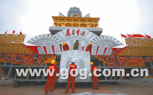 10月26日,在北京国庆游行中亮相的“多彩贵州”彩车将和贵阳市民见面。昨日在贵阳市人民广场南广场,二十几个工人正在加紧组装。 据了解,在北京游行结束后,“多彩贵州”彩车经过拆卸,19日晚由10辆12米长的拖车运到贵阳,组装完成后,将在贵阳展出一周。