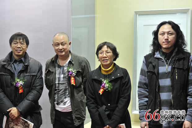 贵州画院院长陈争(左一)和本次参展画家潘闻丞(左二)、胡世鹏(右一)的合影