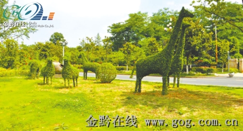 6月19日,记者在观山湖区的观山路、林城路等路段看到,园林绿化部门在观山路上种植的“长颈鹿”、“绵羊”等造型的园艺景观已经泛出新绿,呈现出“一路一景”的城市新景观。