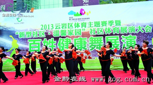 8月6日上午,贵阳市云岩区开展了“新型社区·温馨家园”百姓健康舞展演活动,共有24支队伍表演48个节目。此展演是云岩区体育主题赛季系列活动之一,是结合全国的“全民健身日”举行的一次大型的健康舞展演活动。