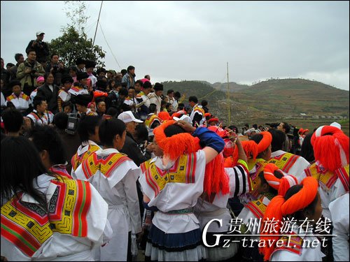 4月2日,正是农历的早春二月,漫山泛绿,桃李争艳,水城县一年一度的苗族跳花节在南开乡三口塘举行。来自水城县及周边县、乡的苗族同胞,还有来自日本、法国、美国等外国游客,云南、广西等省外游客,中央、省、市电视台、报社等新闻媒体的记者,县四大班子、县旅游局、县民宗局、南开乡等有关领导等3万余人欢聚一堂载歌载舞同分享这欢快的时光。浓烈的酒香、火红的头饰、精美的服饰伴随着空灵的芦笙音符沸腾了整座大山。其中,苗家青年对唱山歌寻找伴侣成了跳花节的亮点。