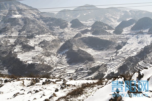 18日一场大雪之后,昨日贵州大部放晴。记者在水城县玉舍镇一个叫“银沟”的地方看到,在太阳的照射下,山野一片银装素裹,呈现出美丽的“梯田雪景”。
