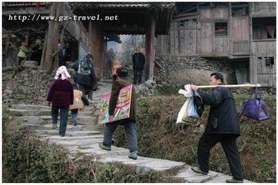 肩扛手提着鸡鸭鱼肉来过节的乡亲