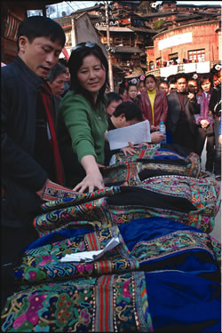 昨日,雷山县西江镇“2006多彩贵州旅游形象大使”选拔大赛报名点上,一场由中国民族博物馆、雷山县委、县政府举办的首届“西江·苗族赛装会”拉开序幕,数百苗族儿女携近7000件苗族服饰欢聚一堂,展示绚丽多彩的民族服饰,踊跃报名参加“旅游形象大使”评选。图:中国民族博物馆副馆长韦荣慧(左二)惊叹苗族服饰的精美。