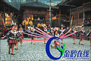 雷山县郎德村苗族少女跳起欢快的舞蹈迎接中外游客。今年首季该村接待旅游者2400多人,同比增长近一倍。