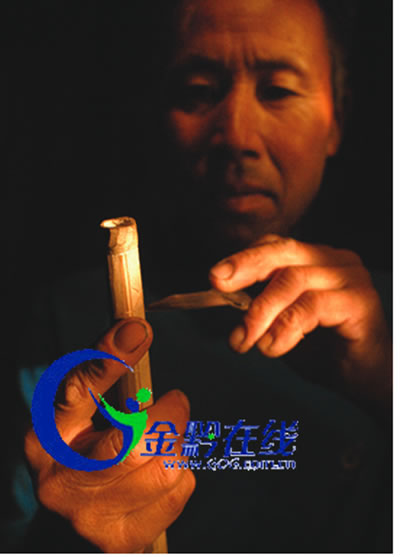 坐在这个农家小院放眼望去,田野被一簇簇青翠的秧苗和明晃晃的水切割成不知几百几千块稻田,从屋檐下一直延伸到天边,间或几个披蓑戴笠的插秧人在忙活。这里就是苗族古歌“刻道”歌师吴治光的家。一个细雨绵绵的夏日,为了寻访传说般神秘的刻道,我们辗转来到施秉县城关镇氵舞阳村。 等了好久,吴治光从田里插秧回来了,腿上还有没有洗尽的泥巴。他解下蓑衣开始生火做饭,忙里偷闲接受采访。他的老伴还在田里干活,上中学的两个孙子孙女马上就要回家吃午饭了。自从儿子和媳妇去广东打工之后,吴治光和老伴的生活就变得更加忙碌。虽然已是60岁的高龄,但是作为留守家里的主要劳动力,犁牛打耙,下田插秧,什么体力活都要干。 在吴治光的记忆里,苗族结亲嫁女都要对唱开亲歌,如果答不出就要被罚酒。年轻时的吴治光因为唱开亲歌而名扬苗山,自从21岁开始唱歌后就没有被罚过酒,常常有对酒当歌三天三夜的记录。那时候四村八寨,谁家有喜事都要请他去对歌。久而久之,吴治光成了远近闻名的歌师。开亲歌牵涉面广,被祖先们以目录的形式刻在一棵笛子大小的木棒上。那些横七竖八的线条,一条就包含了上百行内容,一根歌棒就记载了一万多行的歌词。于是有人把歌棒插在衣襟里,忘词的时候偷偷摸一下就会记起。 随着时间的流逝,苗族的婚姻习俗已经有部分改头换面,请吴治光唱开亲歌的人渐渐少了,年轻人们有电视卡拉ok和麻将娱乐,还要外出打工赚钱养家糊口,没有人对这个不能产生经济效益的刻道感兴趣。吴治光的门庭逐日冷清,刻道曾经给他带来的光环犹如村旁流淌的河水,只在记忆里留下痕迹。只有在夜深人静的时候,他才会用苗语怅然哼上几句:“我们看现在,家家可开亲。男婚女出嫁,老少都高兴……”歌声悠扬婉转,仿佛又回到了当年人声鼎沸的娶媳嫁女场面。 舞阳村偌大的一个村,如今懂得刻道的只有吴治光和他的老伴了。就是整个施秉县,屈指数来,也只剩下寥寥无几的几个歌师,有的村寨已经出现断代的局面。如果不采取措施加以保护,再过20年,刻道将随着这些老人的离世而将淹没在绿水青山里。