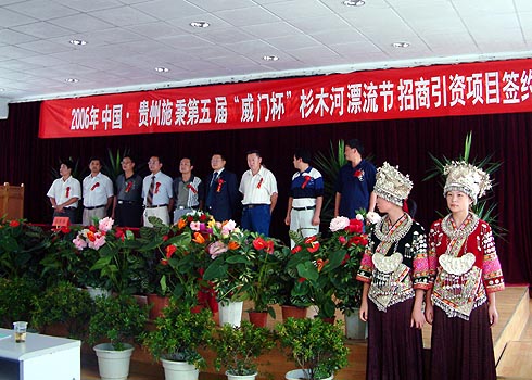 6月17日,“2006中国·贵州施秉第五届‘威门杯’杉木河漂流节”在施秉县三丰迎宾馆大会议室举行招商引资签约仪式。由施秉县县长袁继穆主持此次签约仪式。