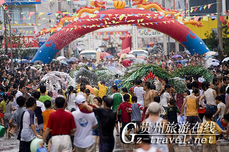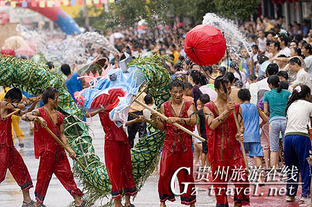 施秉县城玩水龙已有上千年历史。关于“水龙”,在施秉民间有这样一个传说。相传很久以前,有一年久旱无雨,太阳像火一样晒得百花凋谢,五谷不长。人们想尽了各种方法,而老天爷根本没下一滴雨,天下越干越厉害,没有办法的人们只好听天由命了。 一天晚上,一位神仙托梦给一位叫宝公的老人说:“龙、人和狗是亲兄弟,人是老大,龙是老三,狗是老三。兄弟仨长大后,龙分家得到的家产极少,他想不通而负气出走,不想回家。后来,龙成为了掌管风雨的神,可只要一想起分家的事就很生气,于是故意不下雨,让天干使人得不间到好收成。你们如果想得雨,就扎一条水龙,抬上狗,敲锣打鼓上街舞一趟,还要边舞边泼水,一直把龙舞到河边,让龙知道你们心里还有他这个兄弟,这样他就会降雨了。”宝公喜获此言,第二天立即去和寨老们一商量,大家都很赞成扎一条水龙来舞。于是,宝公和寨老便组织各条街道的群众编扎龙,热热闹闹地舞上街,一直舞到河边做完祭祀仪式才回家。果然,龙见到人舞着龙,抬着狗来到河边,想三兄弟又象当初团聚在一起,念及弟兄之情,就呼风唤雨,降下甘霖,解除了人间的旱情。从那以后,每逢五黄六月久旱元雨,群众就择定吉日玩水龙求雨,舞龙的队伍所到之处,街道两侧的居民就用水泼龙,舞龙结束后将水龙投入舞阳河任其自行沉入水中。群众都说泼水龙的水是“吉祥水”,水泼得越多,则表示吉祥如意,兴旺发达,当年就一定会风调雨顺,五谷丰登,国泰民安。如果谁要有幸被泼上吉祥水,就会事业发达,财运兴隆,万事吉祥如意。