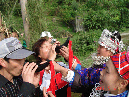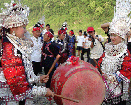 施洞是姊妹节的发祥地,今年的“五一”黄金周,正是这里的姊妹节。慕名而来施洞旅游度假的八方游客以及采风的各路媒体络绎不绝。在杨家寨路口,几十名盛装姑娘拦门敬酒,飘香的牛角酒、五彩的姊妹饭,令大量的游客驻足停留享受,久久不愿离开,导致公路拥挤不堪。在施洞镇清水江河沙坝,施洞、老屯、施秉县马号乡苗族同胞汇聚一堂,举行千人盛装踩鼓,动人的苗家姑娘,美轮美奂的服饰,多彩的舞姿,令游客心醉情迷,忘乎所以,长长短短的摄像机、照相机、手机频频举起,极力争抢每一个精彩镜头,争相与盛装姑娘合影留念。琳琅满目、五彩缤纷的银饰刺绣工艺品吸引众多游客的眼球,他们尽情欣赏、选购,并与苗族妇女互相留下联系地址。而在塘坝村,精彩奇特的苗族婚俗演示现场被几百名记者和游客围个水泄不通,他们爬楼梯、站板凳,掂脚尖,摇摇晃晃的举起摄影机,奋力捕捉,十分火爆。尽兴之余,中外游客涌进附近村寨农户家体验农家乐接待,户主们却进入了紧张的忙碌。